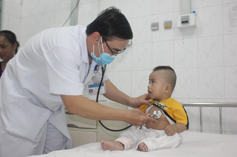 BS Mạc Quốc Dũng kiểm tra sức khỏe cho bệnh nhi sau khi bệnh nhi nuốt mảnh thủy tinh