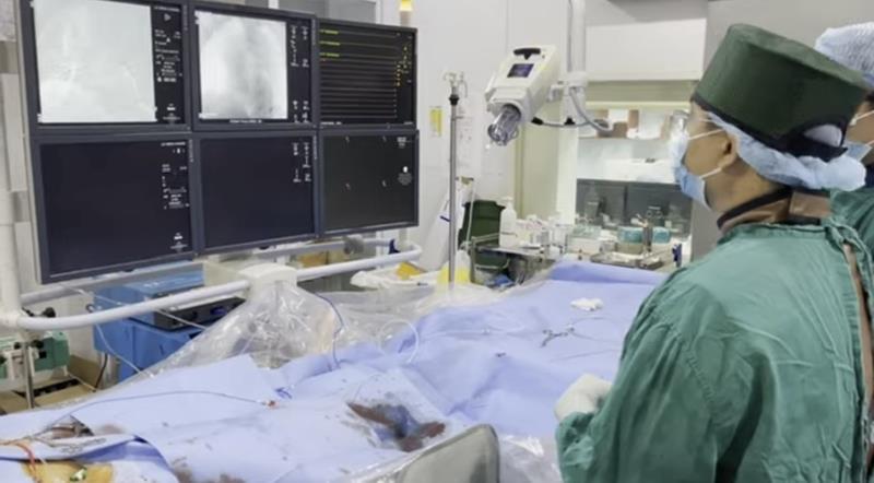 Để khôi phục dòng máu trong lòng thật, kịp thời cứu sống bệnh nhân, các bác sĩ đã thực hiện mở bộc lộ 2 mạch máu đùi 2 bên. Sau đó đưa hệ thống ống ghép (stent graft) lên trên ngực và thả ống ghép từ phía động mạch chủ bình thường xuống ½ động mạch chủ ngực, che chỗ rách ban đầu. Sau khi làm xong thì hệ thống dòng chảy được khôi phục ngay, áp lực của động mạch đùi 2 bên tăng lên về giá trị bình thường.