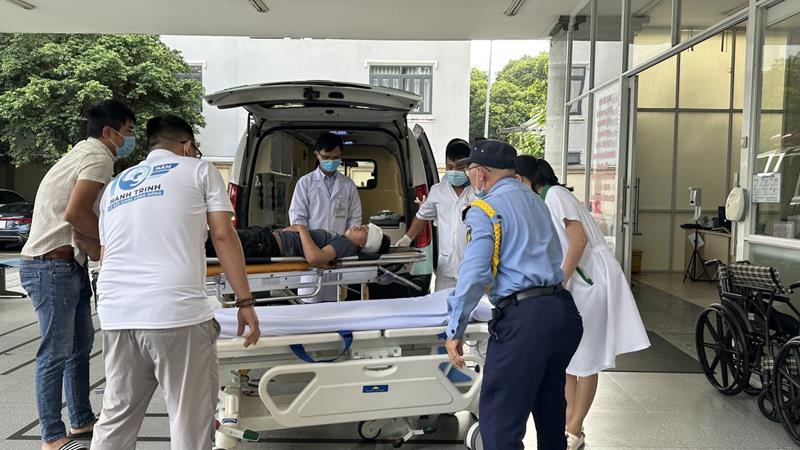 Kíp trực cấp cứu ngoại viện Bệnh viện Quốc tế Hoàn Mỹ Đồng Nai vận chuyển bệnh nhân vào khoa Cấp cứu của bệnh viện để tiếp tục cấp cứu, điều trị.