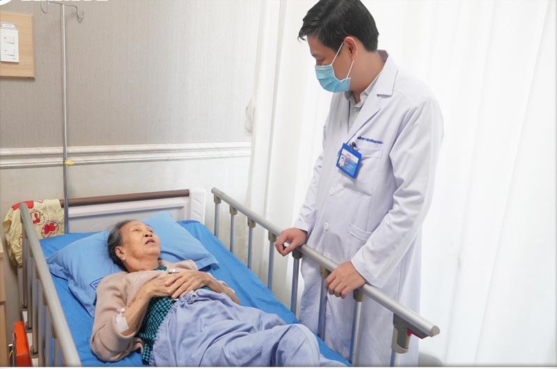 Bác sĩ khám bệnh cho cụ M trước khi cụ được xuất viện về nhà