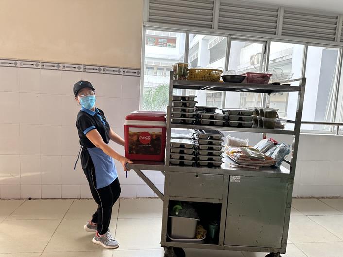 Nhân viên bếp ăn tập thể Bệnh viện Đa khoa khu vực Long Khánh vận chuyển các suất ăn từ bếp lên các khoa, phòng của bệnh viện cho bệnh nhân
