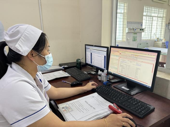 Nhân viên y tế nhập dữ liệu khám, chữa bệnh của bệnh nhân lên hệ thống quản lý.