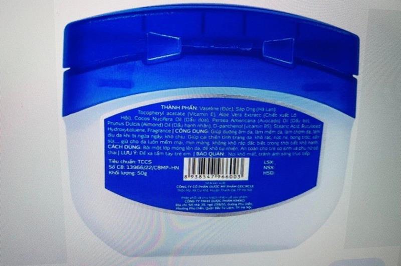 Ngoài ra, đình chỉ lưu hành, thu hồi trên toàn quốc lô sản phẩm VaselineVitamin E - Lọ 50g (Số lô: 251022; NSX: 25-10-2022; HSD: 25-10-2025); trên nhãn ghi thông tin Số CB: 13966/22/CBMP-HN; phân phối và chịu trách nhiệm về sản phẩm: Công ty TNHH dược phẩm KIMIKO; địa chỉ: số nhà 39, ngõ 259/55 đường Phú Diễn, P.Phú Diễn, Q.Bắc Từ Liêm, TP.Hà Nội; nhà sản xuất: Công ty cổ phần dược mỹ phẩm GOCIRCLE; địa chỉ: Thôn Mỹ, xã Cự Khê, H.Thanh Oai, TP.Hà Nội.