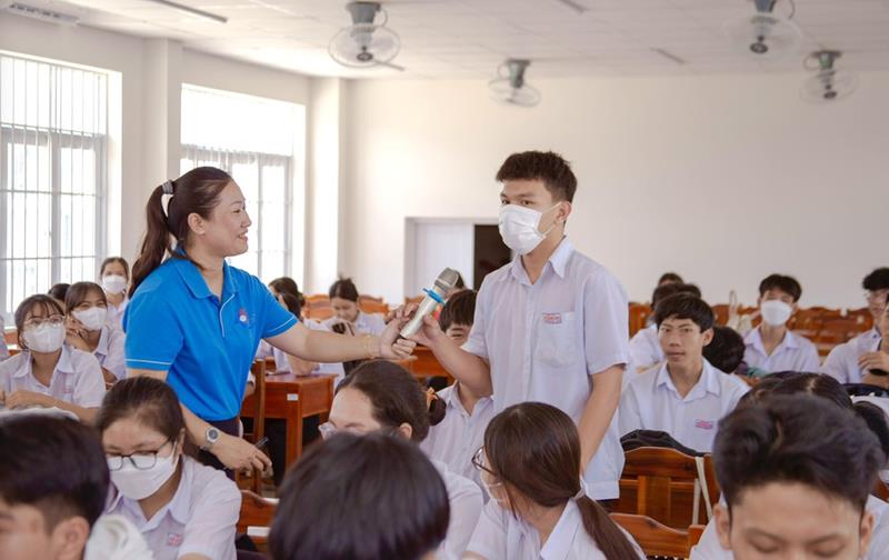 Giảng viên Trường Cao đẳng Y tế Đồng Nai trao đổi với học sinh trong một buổi truyền thông - giáo dục SKSS cho học sinh THPT.