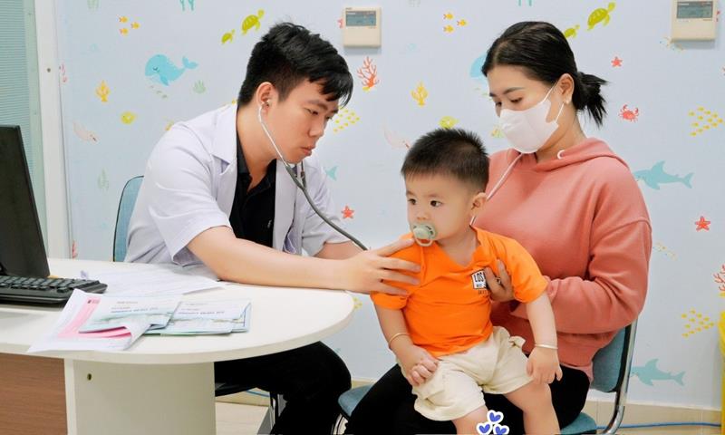 Bác sĩ khám sức khỏe trước tiêm chủng cho một em bé