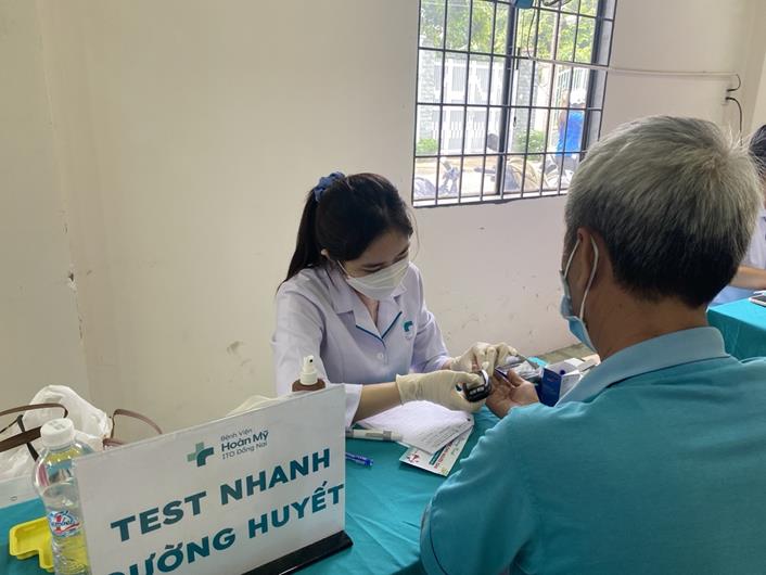 Bác sĩ test đường huyết cho người dân để phát hiện sớm những bất thường.