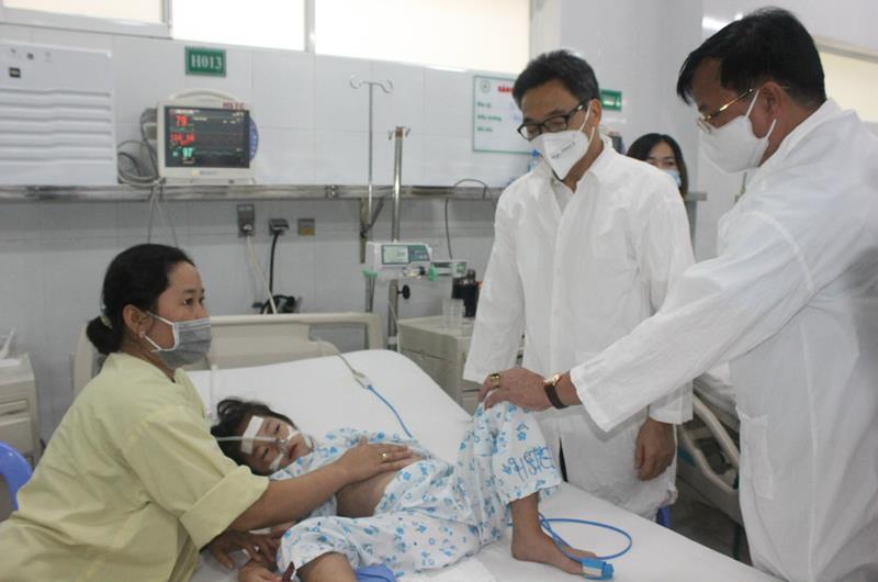 Phó Thủ tướng Chính phủ Vũ Đức Đam và Chủ tịch UBND tỉnh Cao Tiến Dũng thăm hỏi bệnh nhi đang điều trị tại cơ sở y tế trong tỉnh