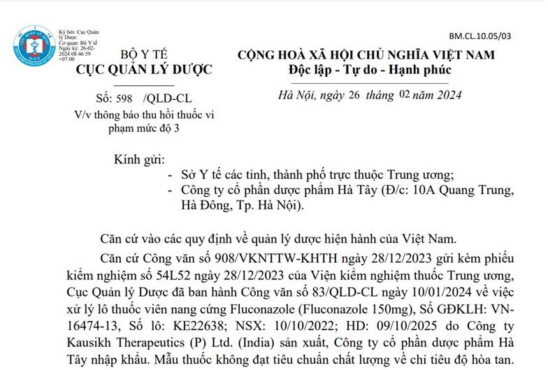 Một phần văn bản của Cục Quản lý Dược về việc thu hồi lô thuốc Fluconazole 150mg không đạt chất lượng