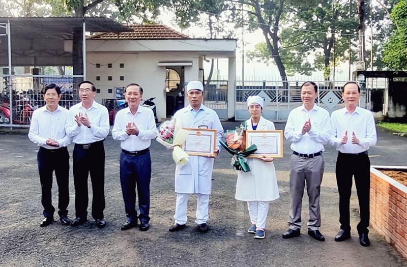 Ông Nguyễn Hữu Thành, Phó Chủ tịch UBND huyện Long Thành và BS CKII Lưu Văn Dũng, Phó giám đốc Sở Y tế trao giấy khen cho các cá nhân.