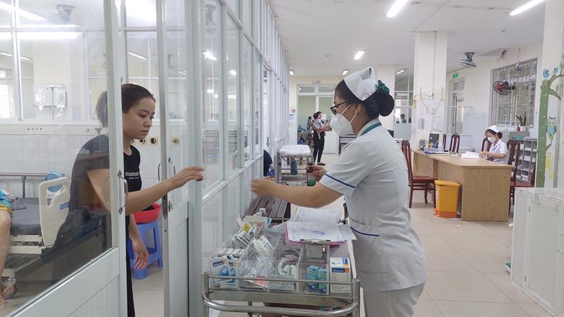 Nhân viên y tế phát thuốc để phụ huynh cho bệnh nhi uống điều trị bệnh tay chân miệng