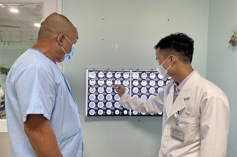 Bác sĩ chỉ cho bệnh nhân thấy khối máu tụ dưới màng cứng bán cầu não trái trên phim chụp sau khi ca phẫu thuật thành công