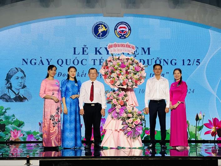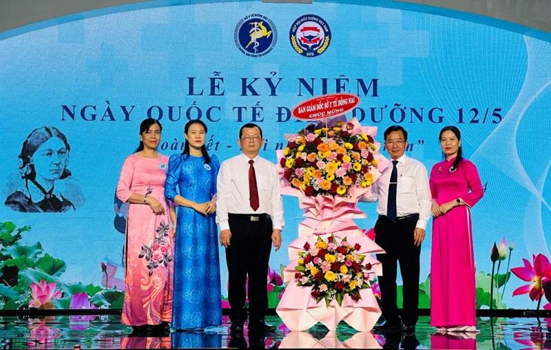 Phó Giám đốc Bệnh viện Đa khoa Đồng Nai Đinh Cao Minh (thứ 2 từ phải sang) tặng hoa chúc mừng tại lễ kỷ niệm