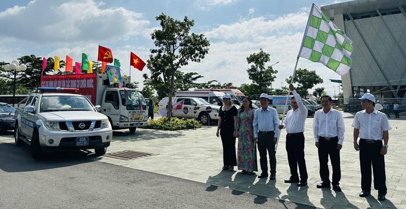 Lãnh đạo tỉnh và lãnh đạo các địa phương phất cờ ra hiệu cho đoàn xe diễu hành xuất phát tuyên truyền các biện pháp phòng chống dịch bệnh