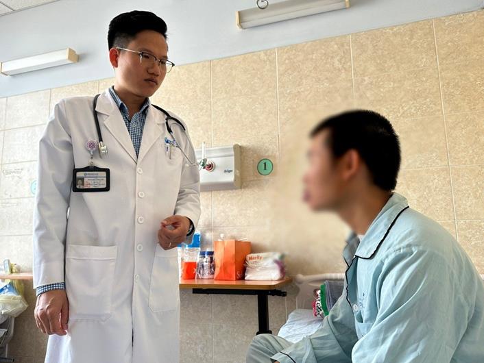 BS CKI Nguyễn Văn Tới kiểm tra sức khỏe cho anh N. trước khi xuất viện