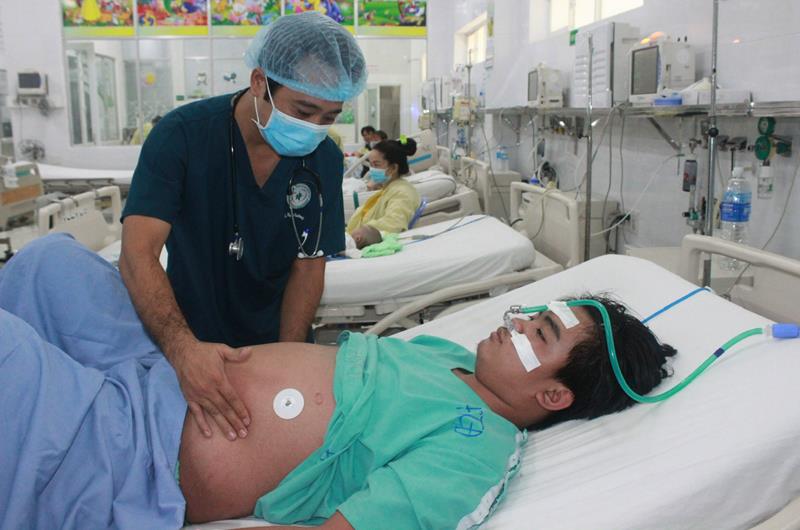 Bác sĩ khám bệnh cho 1 bệnh nhân mắc sốt xuất huyết nặng