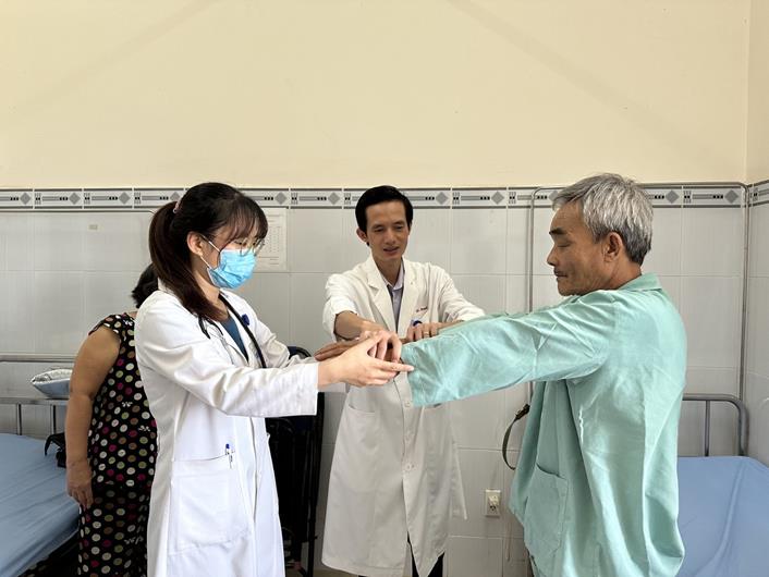 Các bác sĩ kiểm tra chức năng vận động của ông T. sau khi được cấp cứu qua cơn nguy hiểm