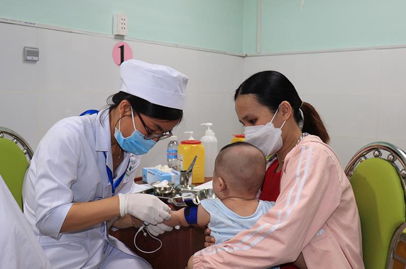 Nhân viên y tế lấy máu để khám sàng lọc cho bệnh nhi