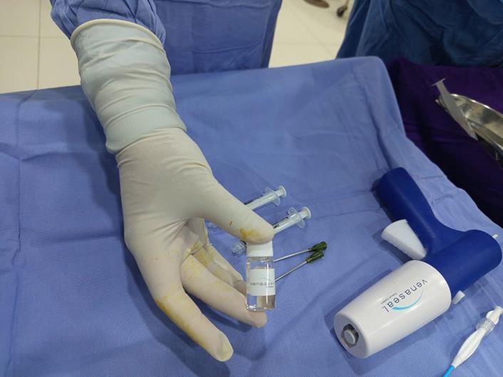 Các dụng cụ, thuốc để thực hiện một ca phẫu thuật điều trị suy giãn tĩnh mạch chi dưới.