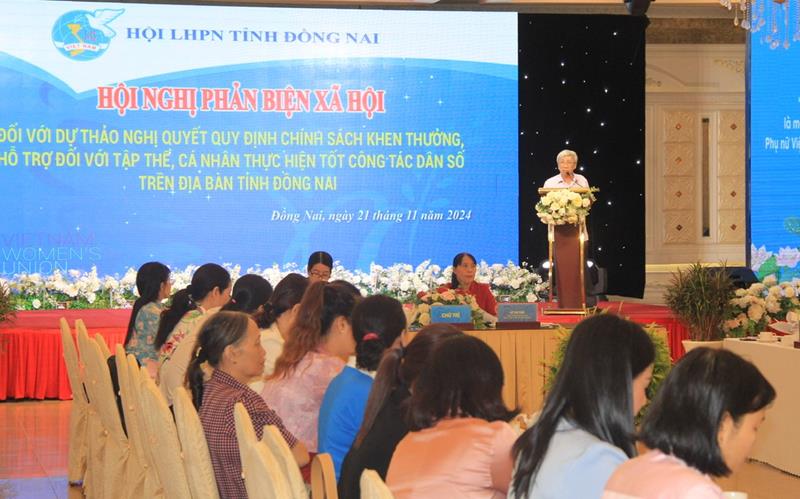 (CTT-Đồng Nai) - Sáng 21-11, Hội Liên hiệp phụ nữ (LHPN) tỉnh đã phối hợp với Ủy ban MTTQ tỉnh tổ chức Hội nghị phản biện xã hội đối với dự thảo nghị quyết quy định chính sách khen thưởng, hỗ trợ đối với tập thể, cá nhân thực hiện tốt công tác dân số trên địa bàn tỉnh Đồng Nai.