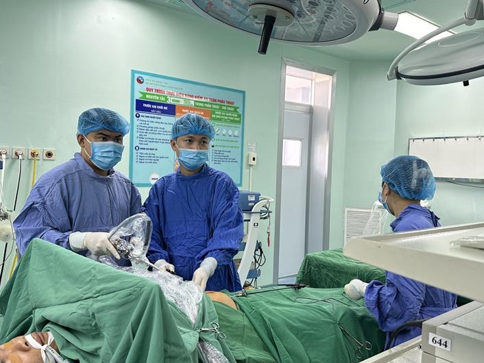 BS CKI Trần Quang Tiến (giữa) thực hiện phẫu thuật nội soi cắt ruột thừa cho bệnh nhân
