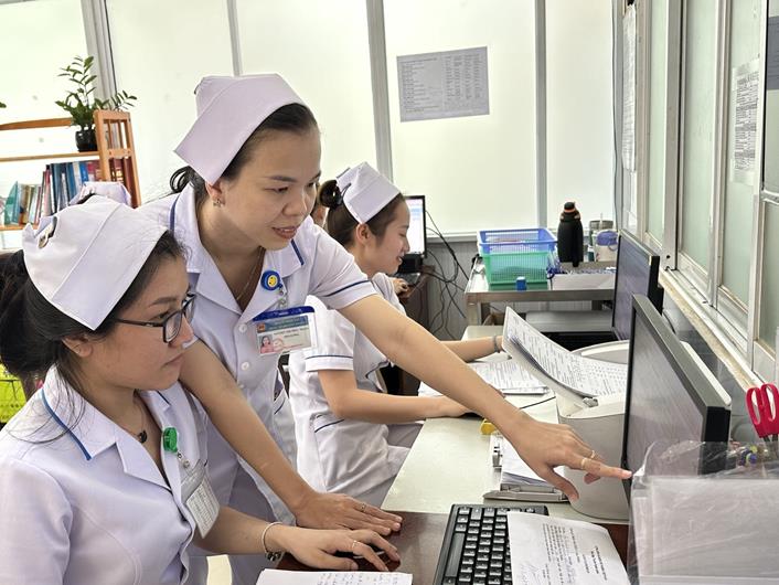 Điều dưỡng Nguyễn Thị Thùy Trang hướng dẫn điều dưỡng trẻ nhập liệu bệnh án điện tử