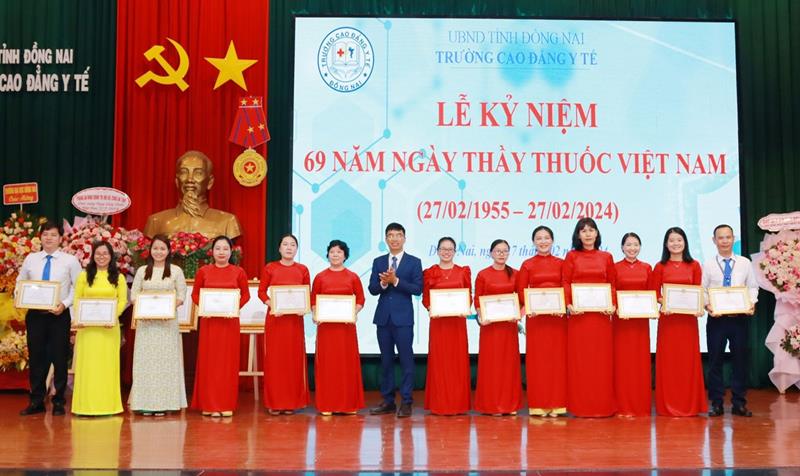 TS. Nguyễn Hồng Quang Hiệu trưởng Trường Cao đẳng Y tế Đồng Nai trao giấy khen khen thưởng đột xuất các cá nhân có thành tích xuất sắc