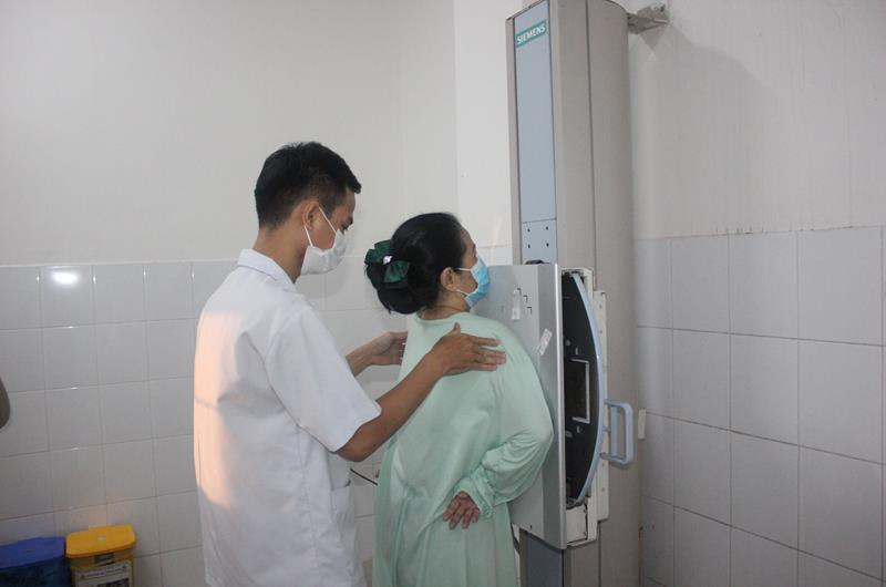 Nhân viên y tế chỉnh tư thế để chụp X-quang cho bệnh nhân tại Bệnh viện Đa khoa Thống Nhất