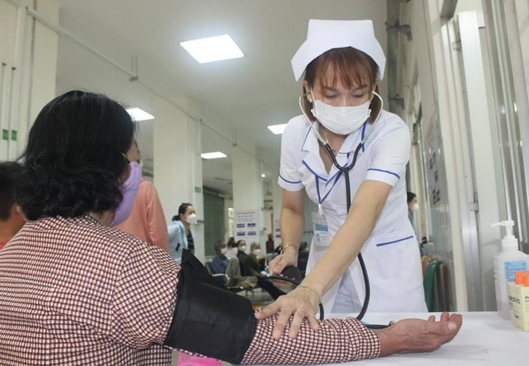 Điều dưỡng Hồng Nhung đo huyết áp cho một bệnh nhân trước khi bệnh nhân vào phòng khám bệnh