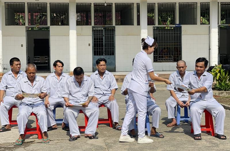 Điều dưỡng Bích Ngọc phát tờ rơi tuyên truyền, phổ biến thông tin cho bệnh nhân tâm thần