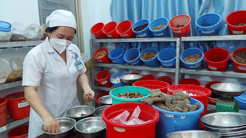 Nhân viên y tế bốc thuốc tại Bệnh viện Y dược cổ truyền tỉnh