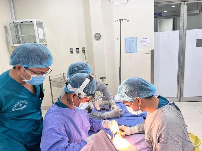 Các bác sĩ thực hiện ca phẫu thuật che khuyết hổng da đầu cho bệnh nhân