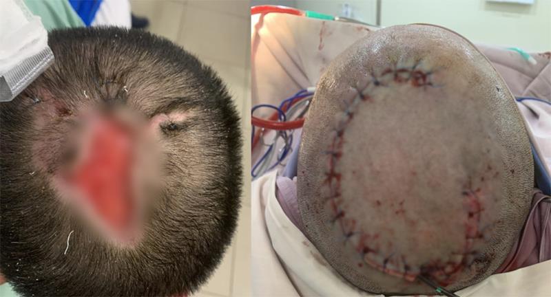 Vùng da đầu của bệnh nhân trước và sau khi được che khuyết hổng