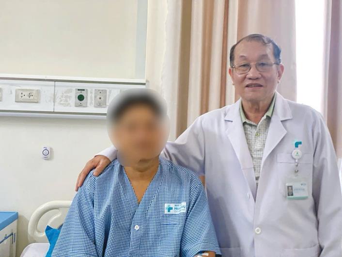 Bệnh nhân vui vẻ cảm ơn, chụp hình lưu niệm với bác sĩ trước khi được xuất viện.