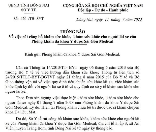 (CTT-Đồng Nai) Sở Y tế vừa ban hành Thông báo số 420/TB-SYT rút công bố khám sức khỏe, khám sức khỏe cho người lái xe của Phòng khám đa khoa Y dược Sài Gòn Medical (địa chỉ tại ấp 3, xã An Viễn, H.Trảng Bom, tỉnh Đồng Nai). Thời gian thực hiện từ ngày 11-7-2023.