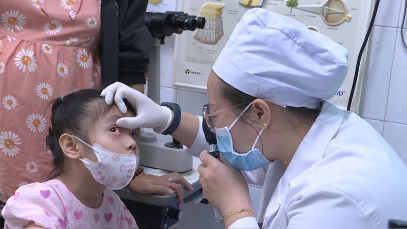 Trẻ bị đau mắt đỏ được khám mắt tại Bệnh viện Nhi đồng Đồng Nai.