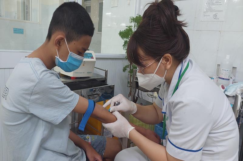 Một bệnh nhân bị sốt xuất huyết được lấy máu làm xét nghiệm tại Bệnh viện Nhi đồng Đồng Nai