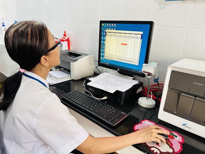Nhân viên y tế Trung tâm Y tế huyện Long Thành đọc kết quả xét nghiệm đàm nhằm phát hiện bệnh lao qua máy xét nghiệm Gen Xpert