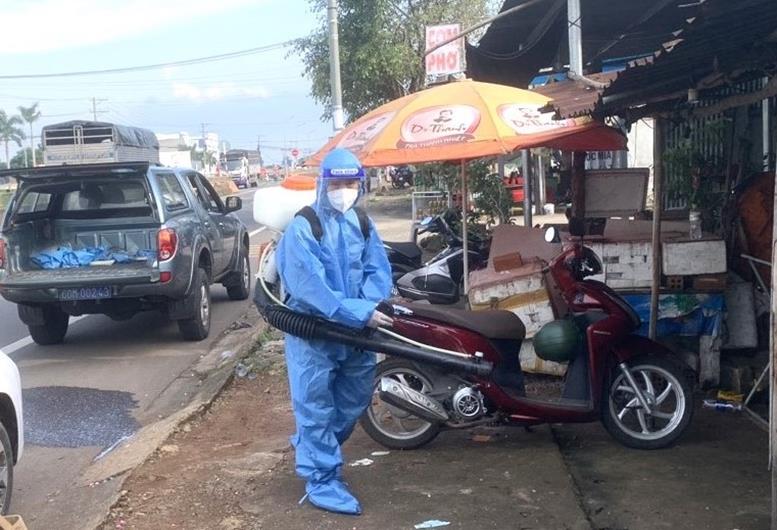 Nhân viên y tế phun thuốc khử trùng khu vực có ổ dịch chó dại tại H.Thống Nhất