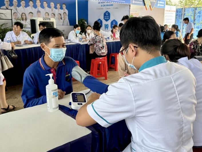 Người dân được khám, đo huyết áp miễn phí tại chương trình từ thiện của một bệnh viện trong tỉnh.