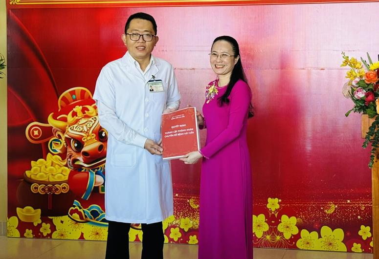 Bác sĩ Lê Thị Thái Hà, Giám đốc Bệnh viện Da liễu Đồng Nai trao quyết định thành lập phòng khám cho bác sĩ Trần Trân Minh Trị