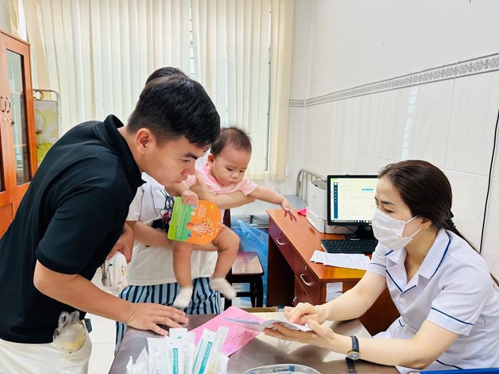 Nhân viên y tế hướng dẫn phụ huynh cần đưa trẻ đi tiêm đúng lịch, đủ liều vaccine