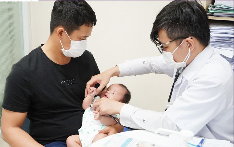 Bác sĩ khám sức khỏe trước tiêm chủng cho trẻ tại một bệnh viện trong tỉnh