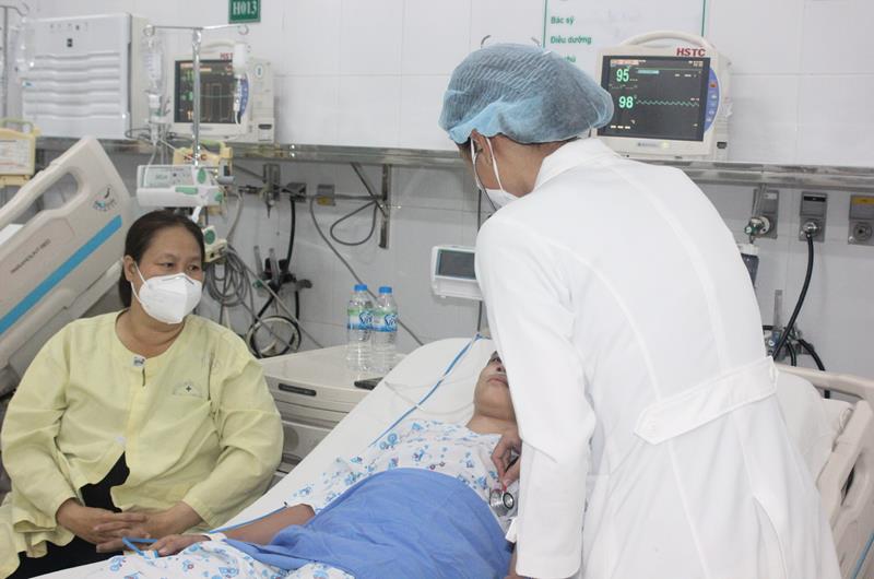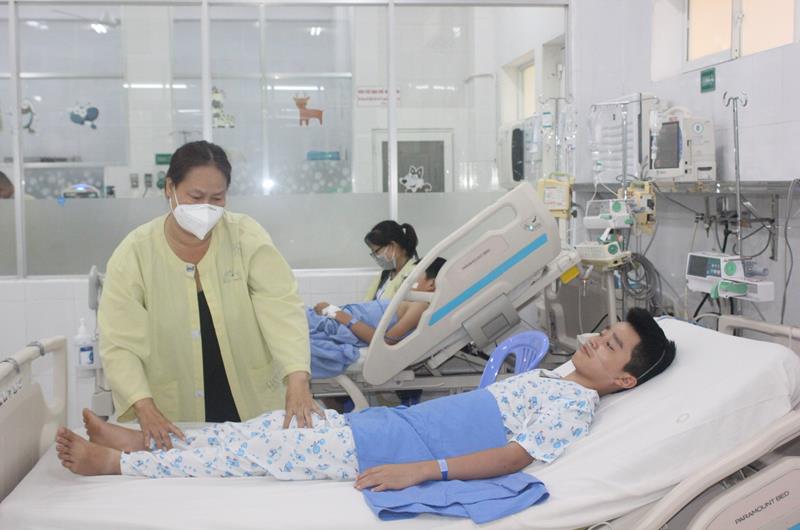 Bà T. đang túc trực chăm sóc con tại bệnh viện