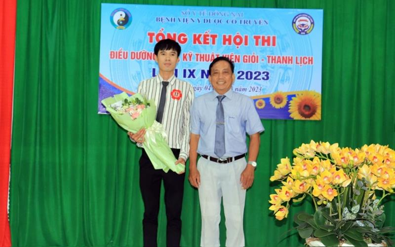 Giám đốc Bệnh viện Y dược cổ truyền tỉnh Phùng Văn Thanh trao giải nhì cho kỹ thuật viên Nguyễn Thái Dũng