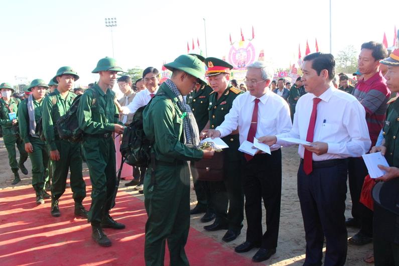 Ủy viên Ban TVTU, Chủ tịch Ủy ban MTTQ Việt Nam Cao Văn Quang tặng quà cho các tân binh lên đường nhập ngũ