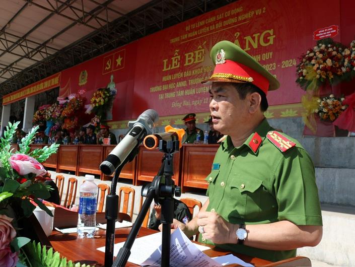 (CTT- Đồng Nai) - Ngày 12-3, Đại tá Phùng Văn Chiến, Phó Tư lệnh Cảnh sát Cơ động dự, phát biểu chỉ đạo tại buổi lễ bế giảng huấn luyện đầu khóa học viên đại học chính quy năm học 2023-2024 tại Trung tâm Huấn luyện và Bồi dưỡng nghiệp vụ II thuộc Bộ Tư lệnh Cảnh sát Cơ động.