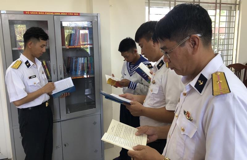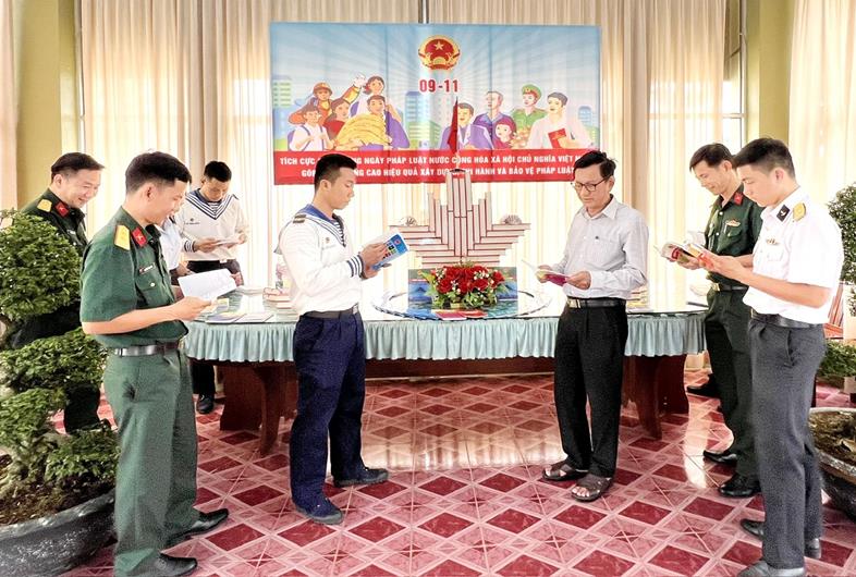 Cán bộ chiến sĩ các đơn vị Vùng 2 Hải quân trên địa bàn tham quan, đọc sách nhân Ngày Pháp luật