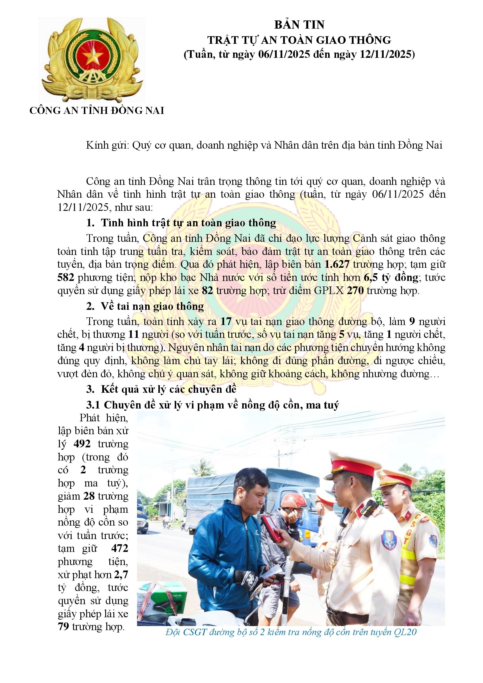 Công an tỉnh Đồng Nai trân trọng thông tin tới quý cơ quan, doanh nghiệp và nhân dân tình hình Trật tự an toàn giao thông trên địa bàn tỉnh (tuần, từ ngày 6 đến ngày 12/11/2025)