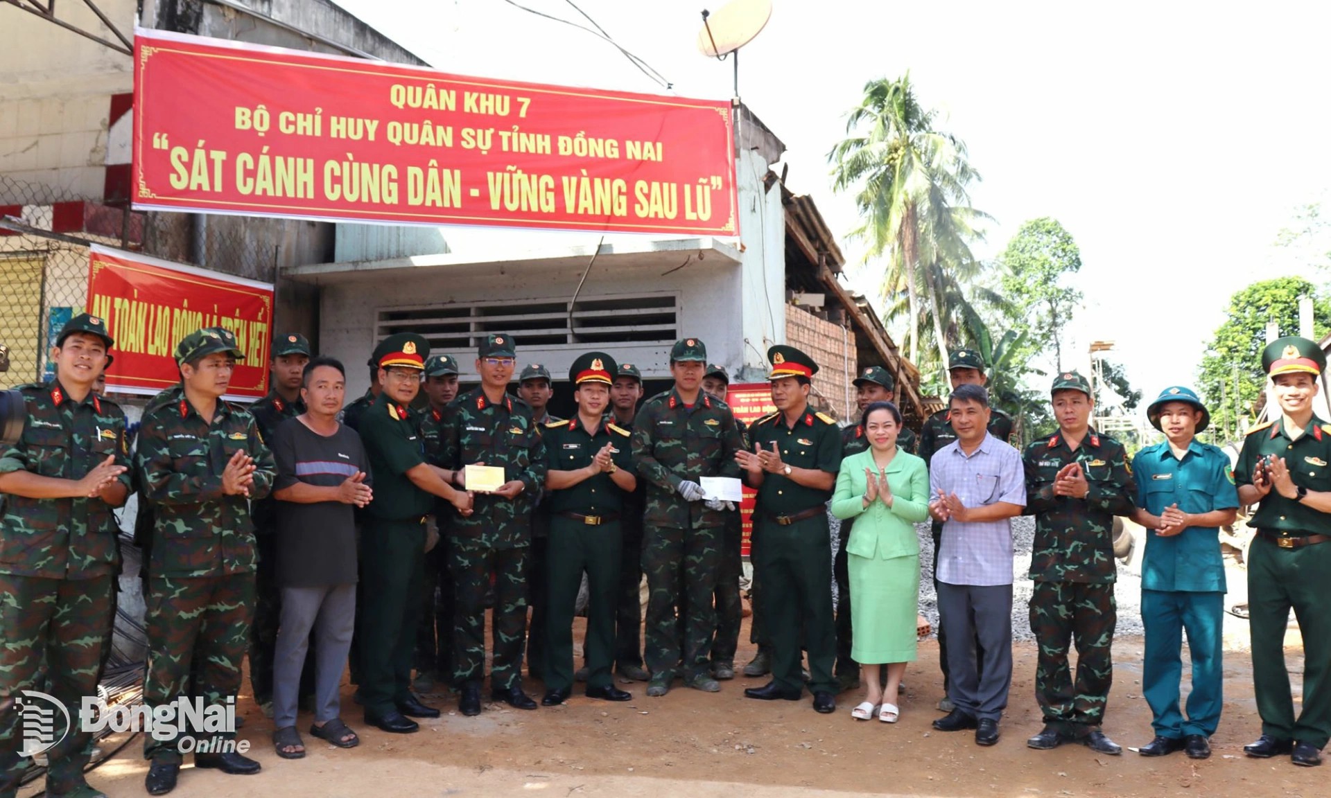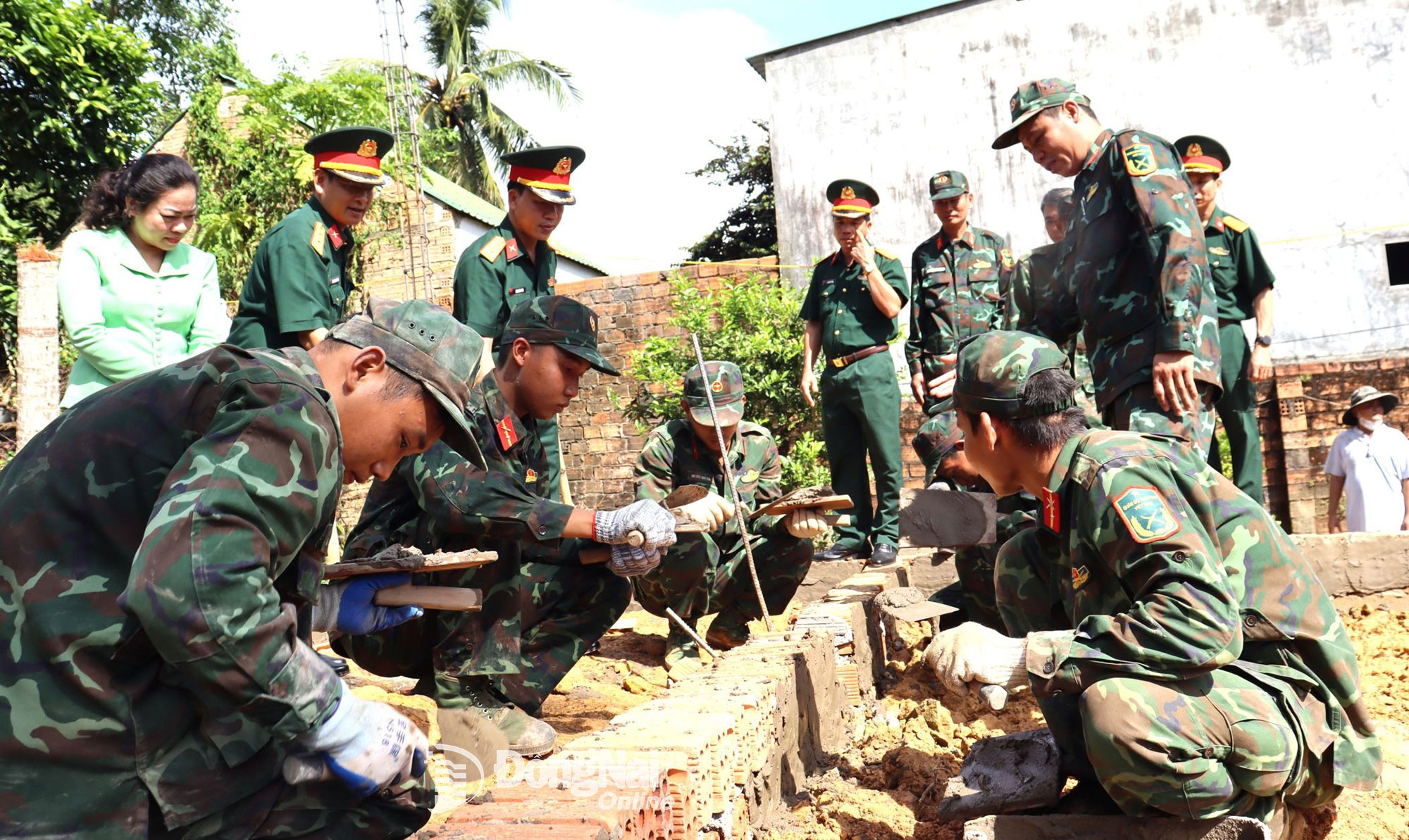 Thủ trưởng Bộ Chỉ huy Quân sự tỉnh Đồng Nai, các cơ quan Bộ Chỉ huy Quân sự tỉnh Đồng Nai và chính quyền địa phương động viên lực lượng xây dựng nhà cho người dân. Ảnh: Nguyệt Hà