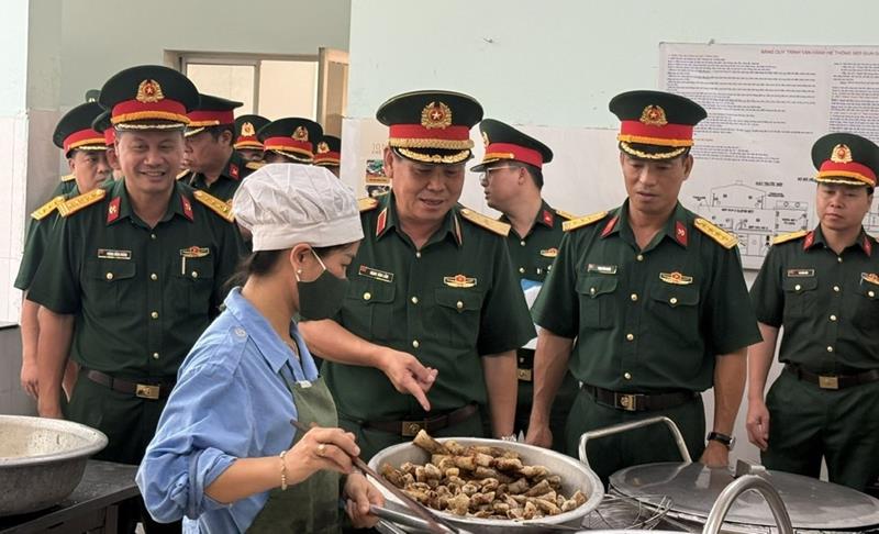 Phó Tư lệnh Quân khu 7 kiểm tra khu vực nhà ăn của Lữ đoàn 25 nơi phục vụ cho lực lượng 3 khối nữ về thực hiện A50